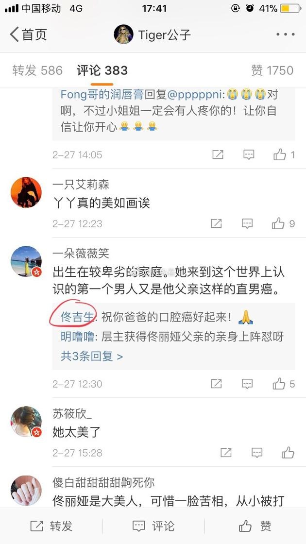 佟丽娅父亲怼网友:祝你爸爸的口腔癌好起来
