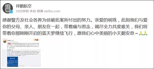 “感谢警方及社会各界为侦破此案所付出的努力。亲爱的明珠,此刻我们与爱你的父母、亲人、朋友在一起,带着痛与思念,竭尽全力共度难关,我们将带着你那刚刚开启的蓝天梦继续飞行,愿我们心中美丽的小天鹅安息。”