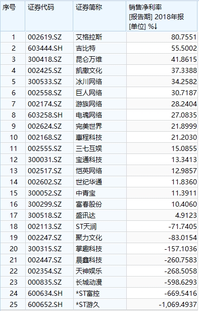 2018年55.5%的净利率,让吉比特排在A股25家游戏类上市公司的第二位,仅落后于艾格拉斯,甚至要高于三七互娱、完美世界和昆仑万维等更为知名的公司。